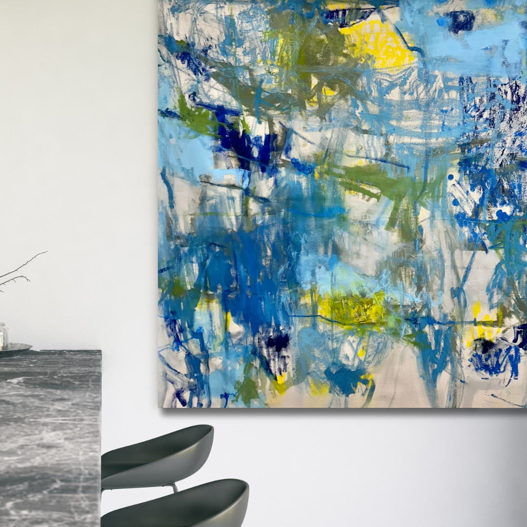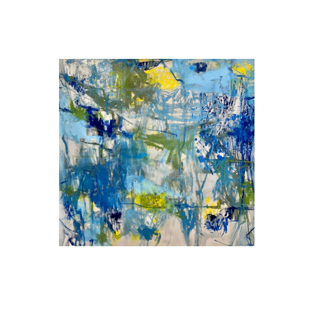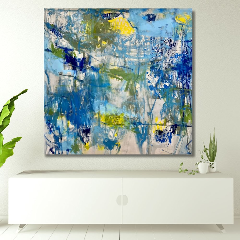 About This Painting Awakening Tide captures a moment of emergence—where movement, light, and layered gesture converge into quiet momentum. Fluid passages of blue and soft neutrals are interrupted by luminous notes of chartreuse and white, creating a rhythmic push and pull that feels both expansive and grounded.