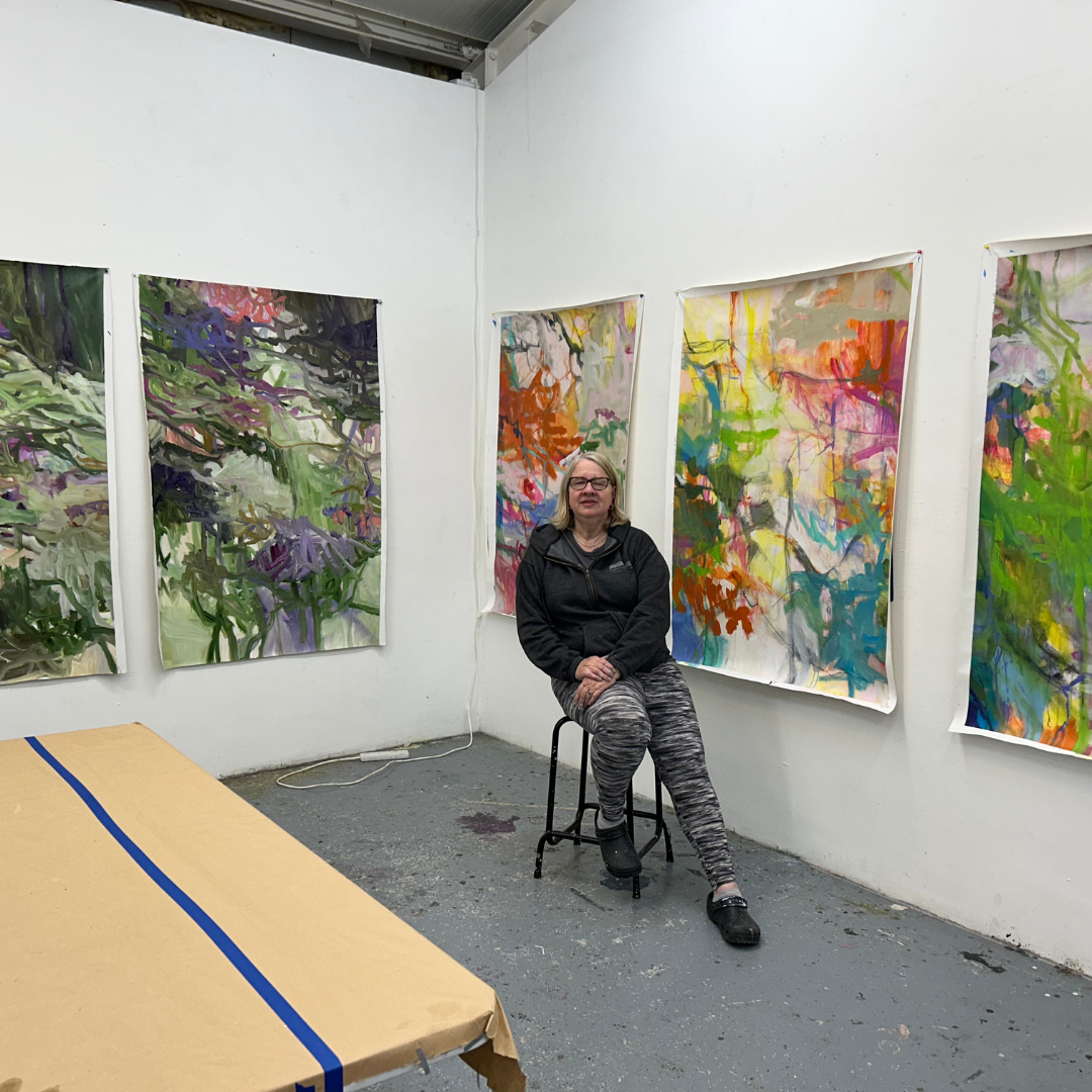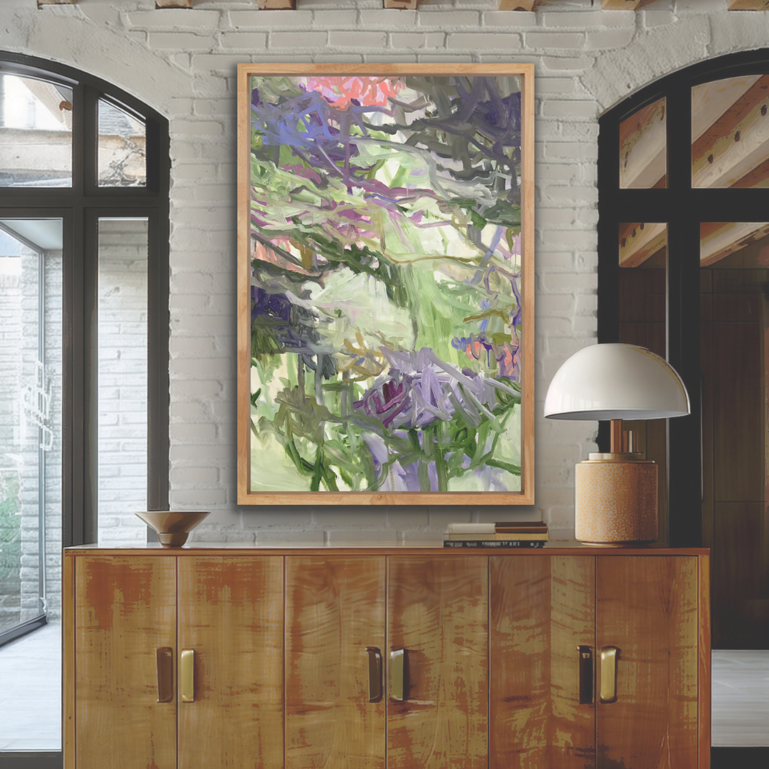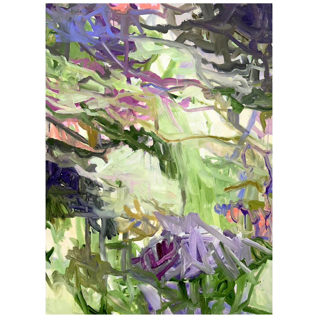 Interlaced greens, softened violets, and restrained flashes of warmth move across each surface in layered gestures that suggest emergence rather than declaration. Mark-making is deliberate and cumulative, echoing seed dispersal, root systems, and the quiet intelligence of natural adaptation. Each canvas holds its own internal rhythm, while together they form a continuous dialogue—past to future, grounding to becoming.